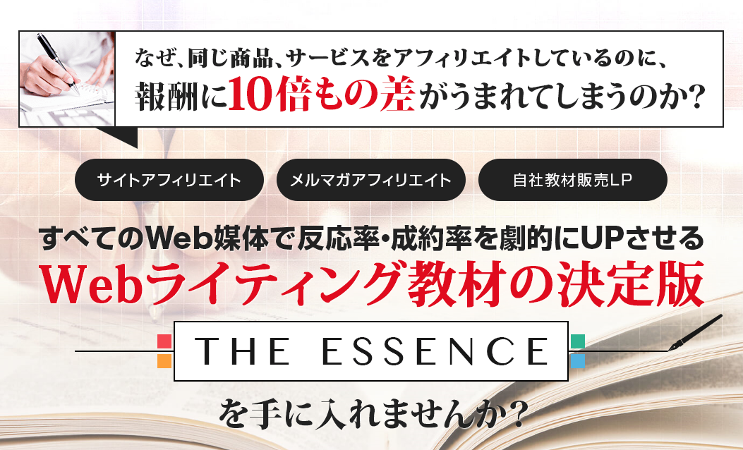 「THE ESSENCE」はライティングの基礎知識や、テクニック、法則が分かりやすく説明されていて、腑に落ちる事が盛り沢山です。さらに自分の問題点も認識出来ます。インターネットで情報発信を考えている方やアフィリエイト初心者の方にぜひお奨めしたいと思います。
