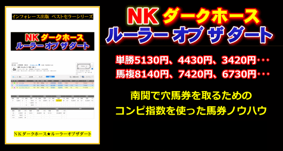 インフォレース出版 藏本育海さんがリリースしている南関馬券術「NKダークホース★ルーラーオブザダート」。