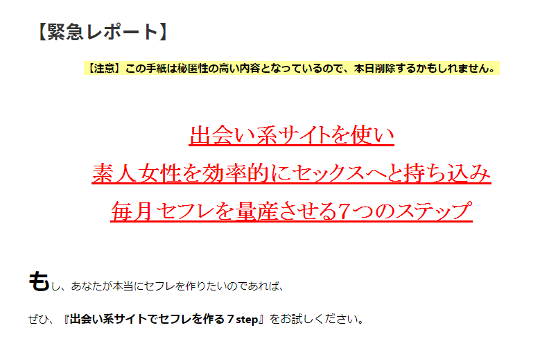 出会い系でセフレを量産できる恋愛ノウハウとして、いまインターネットで話題になっています。