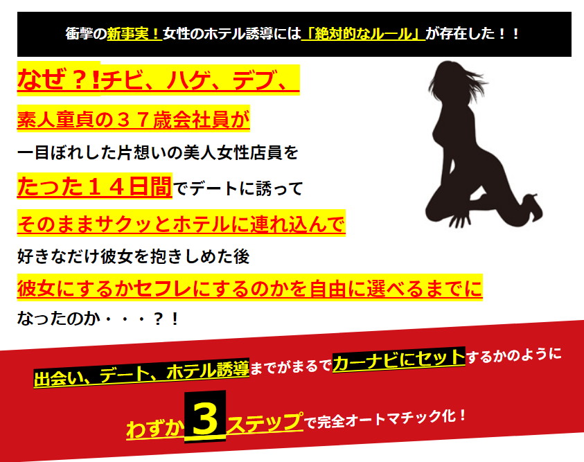 私がこのノウハウを試すなかで特に実感したのが、わかりやすいテンプレート会話が豊富なのとどうやってホテル連れ出しをすれば有効なのかのステップが明確なので、実践に落とし込むことがとても簡単で実際目に見えてすぐに結果が出たので本当に驚きました。これからもガンガンホテル連れ出ししていきたいと思います!ただ一点課題を挙げるとすれば、こんなに簡単にホテル連れ出しが出来てしまうと今までは苦労して女性を落としたという、本来の恋愛においての醍醐味や達成感さえも味わえなくなってしまうので、その意味では効果があり過ぎな点だと思います。これは贅沢なデメリットですね(笑)