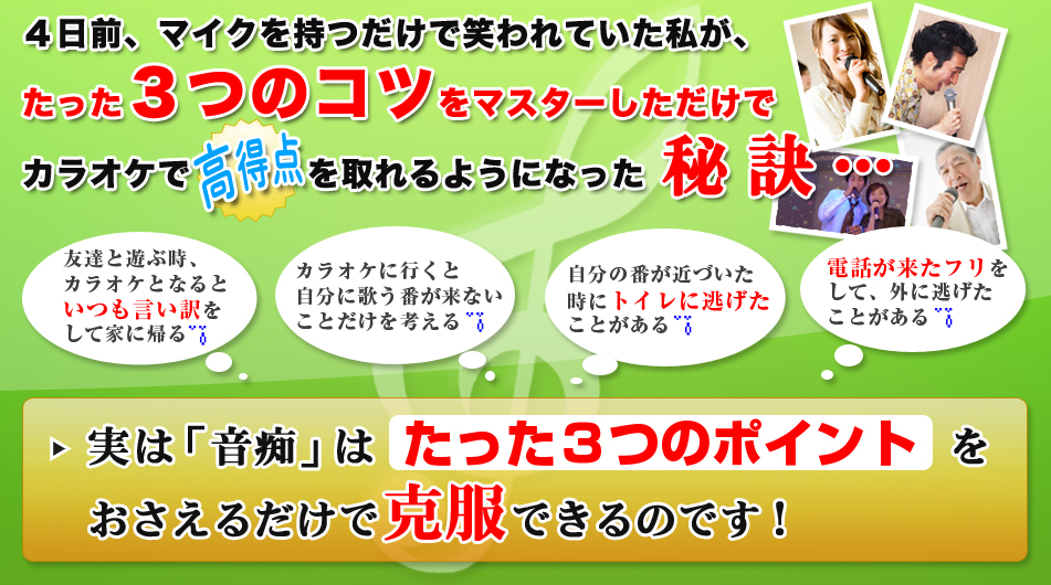 実践さえすれば、4日間で音痴は克服することができ、1ヶ月後には人前で気持ちよく歌えるようになるでしょう。