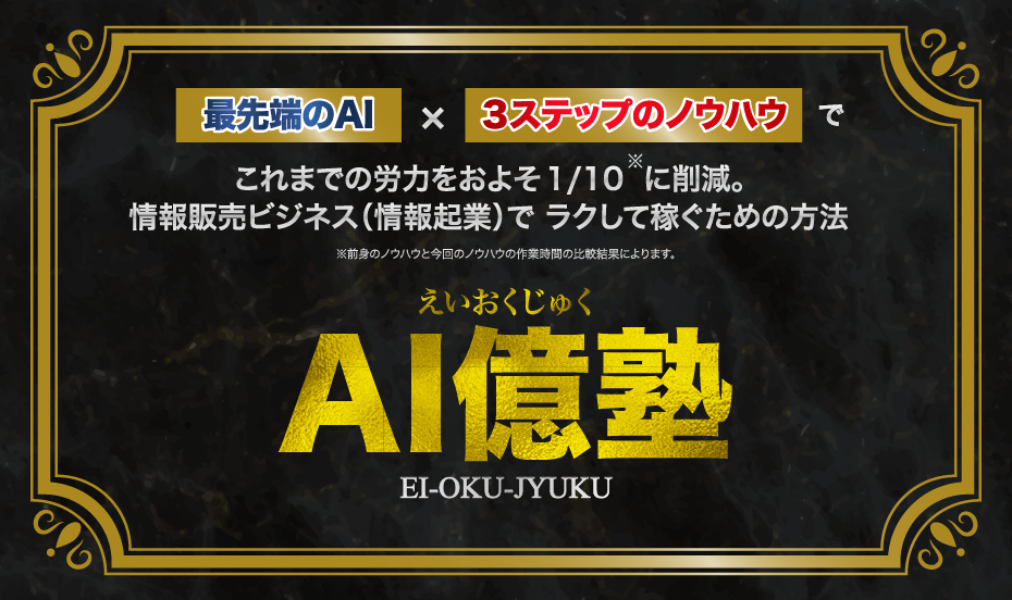⇒ 「AI億塾(えいおくじゅく)AI活用でラクして月収300万円稼ぐための方法」公式サイトへ