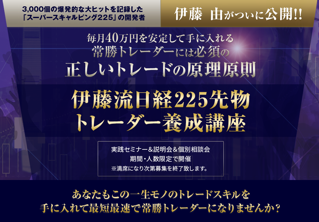 ⇒ 「『伊藤流日経225先物トレーダー養成講座』実践セミナー&説明会&個別相談会」公式サイトへ