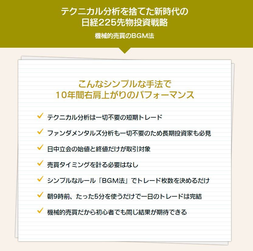 「テクニカル分析を捨てた新時代の日経225先物戦略〜機械的売買のBGM法〜」はこのような特徴を持ち、