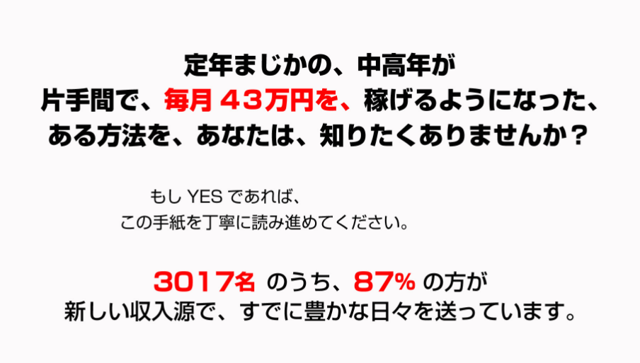 自営業の私が怯えていることは年金が少ないことです。60歳をすぎて不安を感じました。「こりゃマズイ!」と副業をさがし始めたときに、ここを知りました。正直、疑っていたんですけども、60歳をすぎた爺ですが、今月も38万円手に入りました。