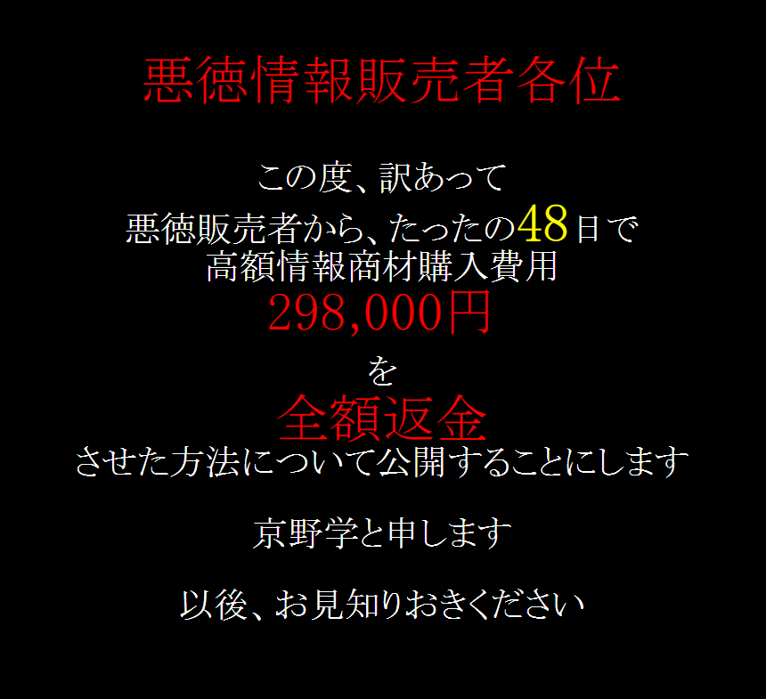 お世話になります。マニュア拝見しました。今まで、色々な情報商材に手を出し、借金が膨らんでいます。楽して稼ぐなんてものは、世の中にはないとわかっていながら、ついつい手をだしてしまいます。先日も、楽して系の悪質な商材を購入してしまいました。返金交渉なんて、自分に出来るかどうかわかりませんが、京野さんのマニュアルにそってやってみます。モニターに選んで頂き有難うございました。