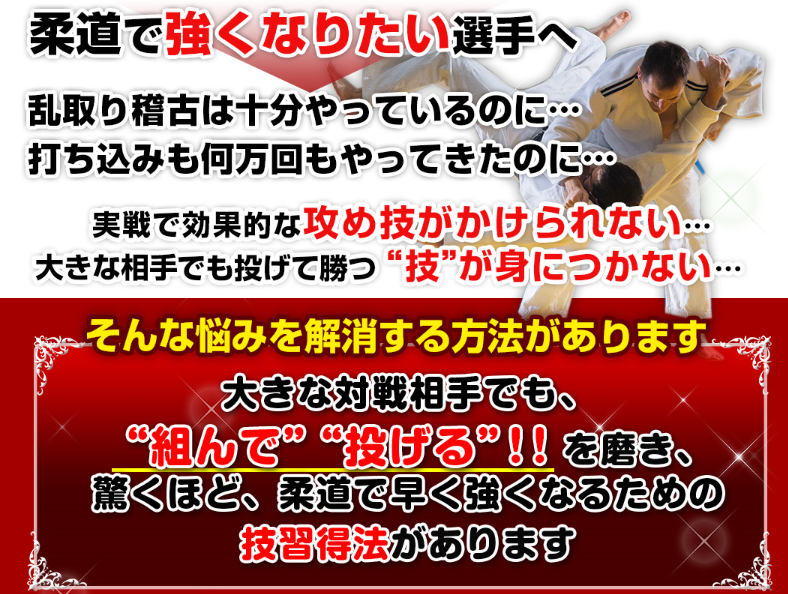 柔道の技術は力が全てではありません。いかに欠点を補う稽古を積んで、テクニックを磨くか?それをサポートするのがこのプログラムです。実践することで、きっと今のレベルを脱皮して、より高いレベルの柔道家に成長できるでしょう。