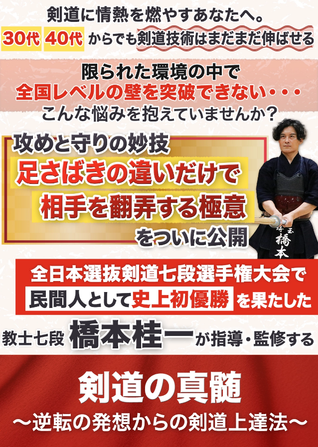 橋本先生が持っておられる知識・技術を惜しみなく、分かりやすい言葉で説明されているので、この動画教材を見て稽古を実践することにより、剣道の上達が期待できると思いますし、剣道の奥ゆかしさにも触れられるのではないでしょうか。