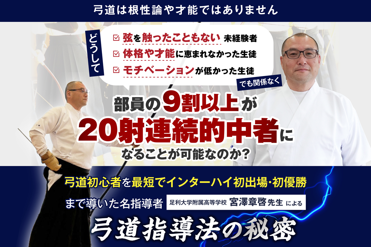 ⇒ 「弓道指導法の秘密〜ポテンシャルを最大化して20射連続的中者が続出する方法〜」公式サイトへ