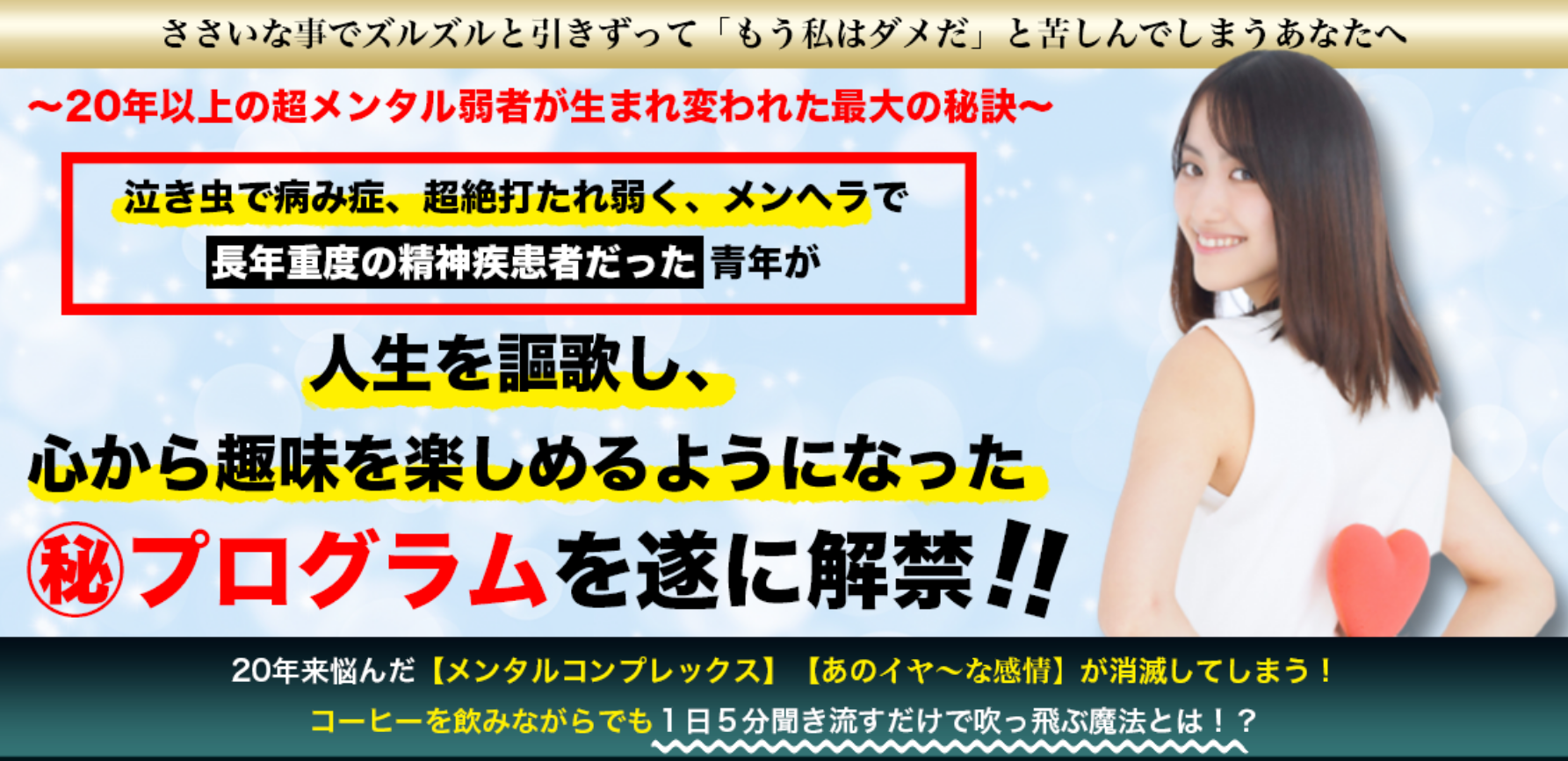 僕はとにかく自分に自信がなく、 小学生の頃から人前で発表なんて出来ず、 おまけにあがり症もコミュ障も持ち合わせている 通称ゲームオタクでした。 ゲームだけが取り柄だった僕を変えてくれたのは、 この○○でした。 まさかそんな方法で??って初めは半信半疑でしたが、 優しくメールサポートもしてくれはったし、おかげで変わることができたんやと思います。 今も職場の個室トイレや鏡の前では あの○○は実践中です!! そして、 彼女も出来ましたんで今を楽しんでいる最中です!!